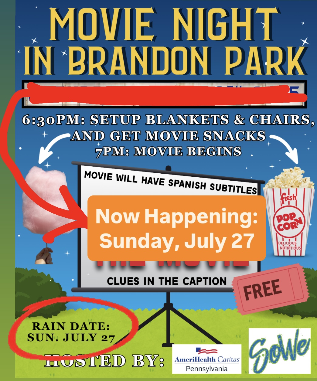 Movie Night will now happen tomorrow, Sunday, July 27th, in Brandon Park. Everything will stay at the same time.