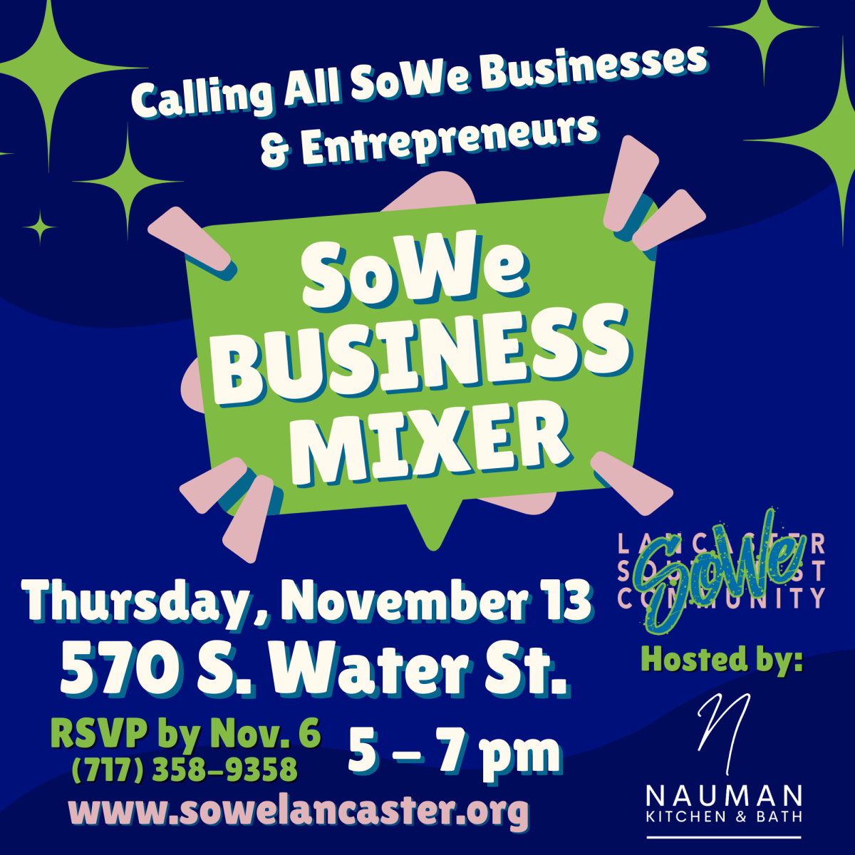 If any of the above are true for you – be sure to not miss this fantastic opportunity to network, collaborate and connect! Please join us on Thursday, November 13th from 5pm to 7pm at one of our recent businesses to move into SoWe – Nauman Kitchen & Bath ย ![]()